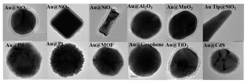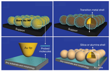 Our group also focuses on the design and synthesis of a variety of plasmonic nanomaterials with core-shell structures that possess ultrahigh SERS activities. Au-core transition metal-shell nanoparticles (Au@TM, where TM = Pt, Pd, Rh, Ru, etc.) and Au/Ag-core dielectric-shell nanoparticles (Au@DE, where DE = SiO2, TiO2, Al2O3, MnO2, graphene, MOF, CdS, etc.) were rationally synthesized for SERS, SHINERS, fluorescence, and other plasmon-enhanced spectroscopy. Such core-shell nanomaterials have also been used in the energy-related applications including photocatalysis, solar cells, and other electrochemical devices. We have also designed core-shell nanotips for SECM, STM, tip-enhanced Raman and fluorescence spectroscopy.